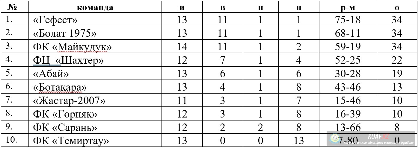 Турнирное положение команд в Первенстве Карагандинской области по футболу 2023 г., по состоянию на 28.08.2023 г.