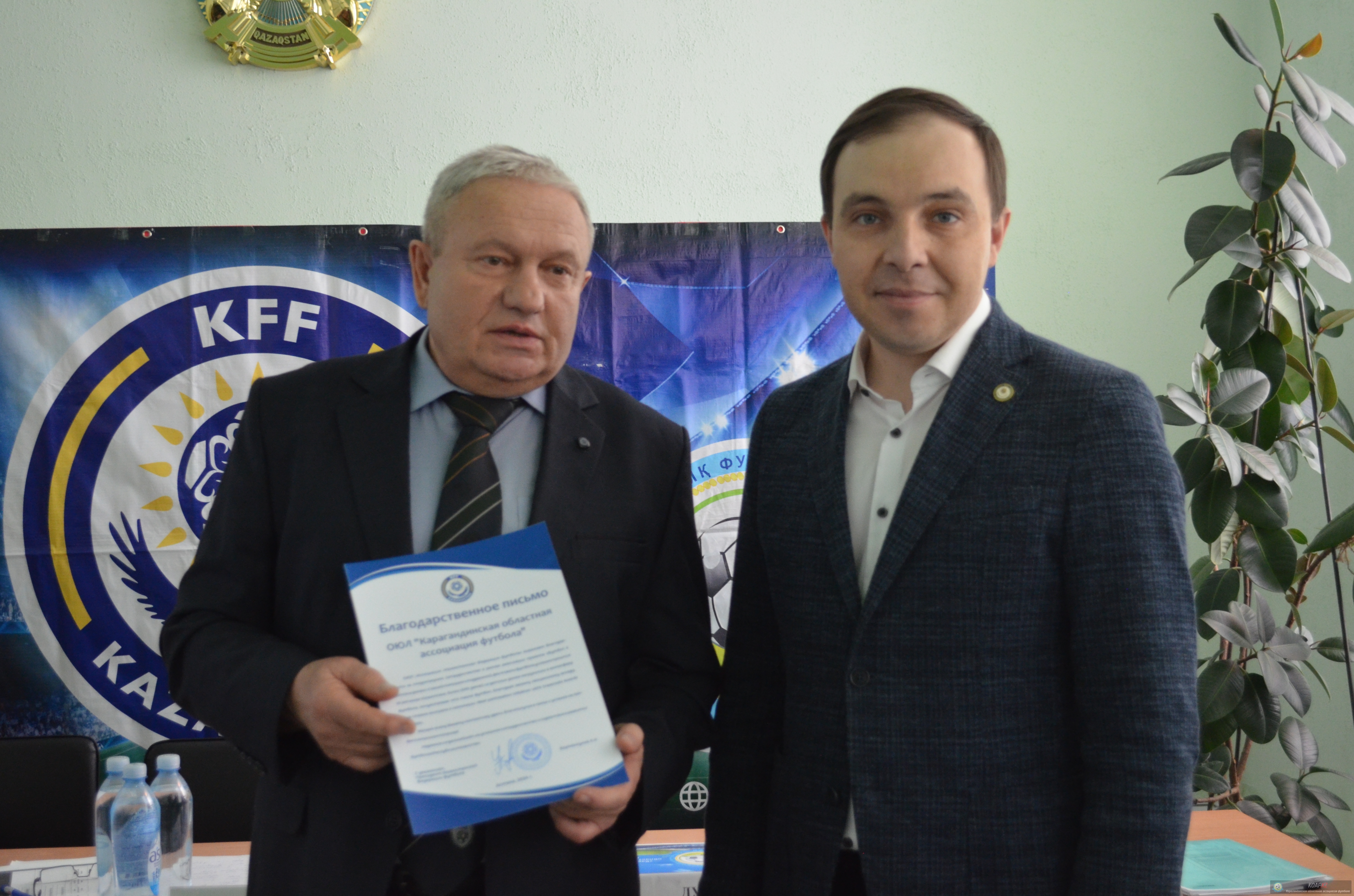 Генеральный секретарь КФФ вручил Благодарственные письма Казахстанской федерации футбола за успешную реализацию в Караганде проекта «Футбол в детских домах» – Сухоруковой Н. Е., АО «Футбольный клуб «Шахтер», ОЮЛ «Карагандинская областная ассоциация футбола».