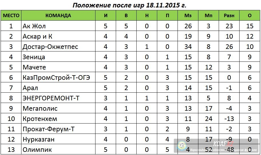 Представляем расположение команд , участвующих в Чемпионате ТЛФЛ, в турнирной таблице по состоянию на 18.11.2015 г.