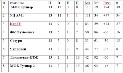 Летнее первенство футзал Представляем Вашему вниманию Таблицу и результаты матчей 13 тура, Открытого летнего Первенства Карагандинской области по футзалу 2017 года среди любительских команд. 12-13 августа. Локомотив-КТЖ - Сатурн1:3ФК Футболист - УД АМТ3:14КарГУ - МФК Тулпар3:10МФК Тулпар-2 - Чкаловец 6:6Бомбардиры: Бодаш Сергей (УД АМТ) - 27 мячейВасильев Станислав (УД АМТ) - 23Швидюк Никита (МФК Тулпар) - 18.скачать dle 10.4фильмы бесплатно Комментарии: 1 Просмотры: 1258 0