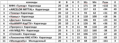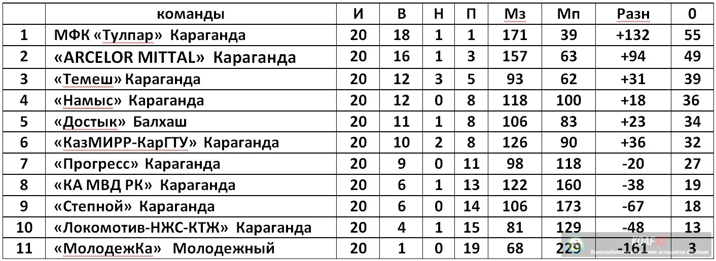 Представляем Вашему вниманию ИТОГОВУЮ ТАБЛИЦУ Первенства Карагандинской области по футзалу сезона 2017-2018 г.г., среди команд Высшей лиги.